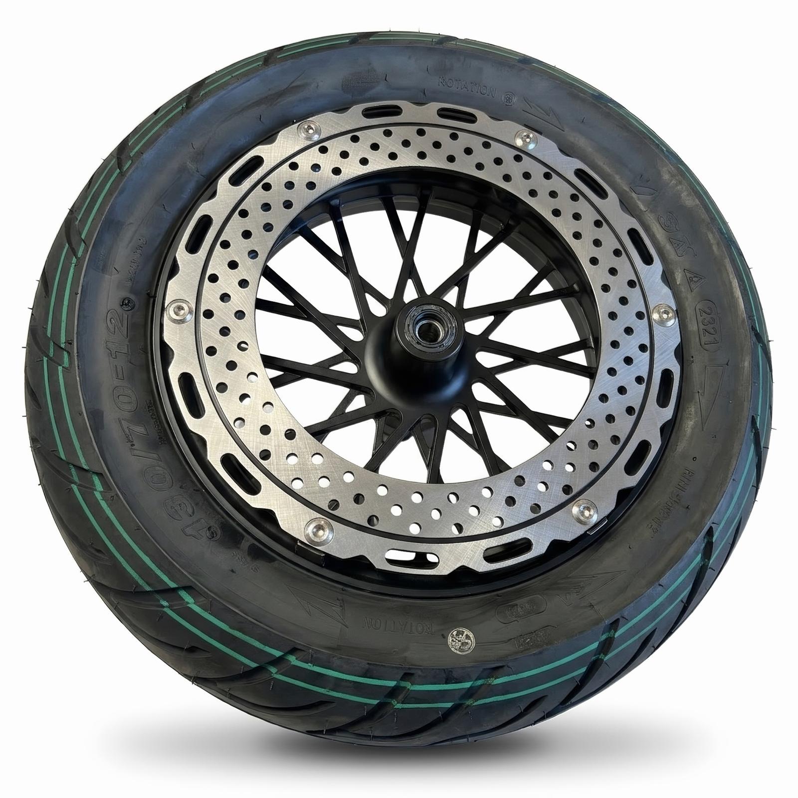 This 130/70-12 front wheel is precisely matched to models such as the Star-Biker M1P, Mangosteen M1P, or Chopper X9 and can be used directly as a spare part.